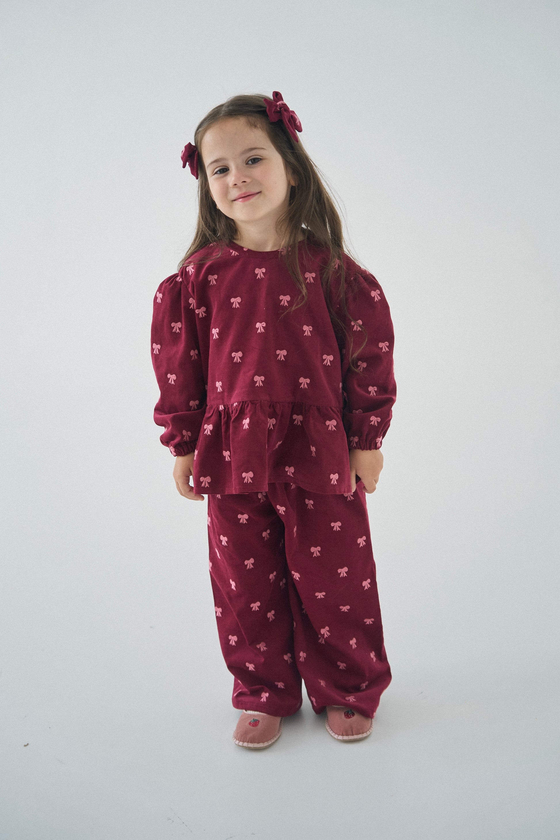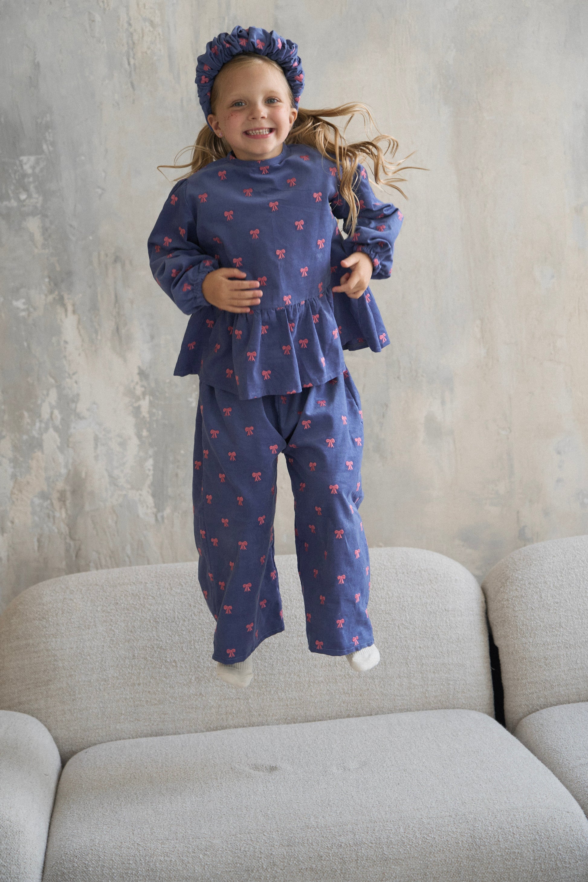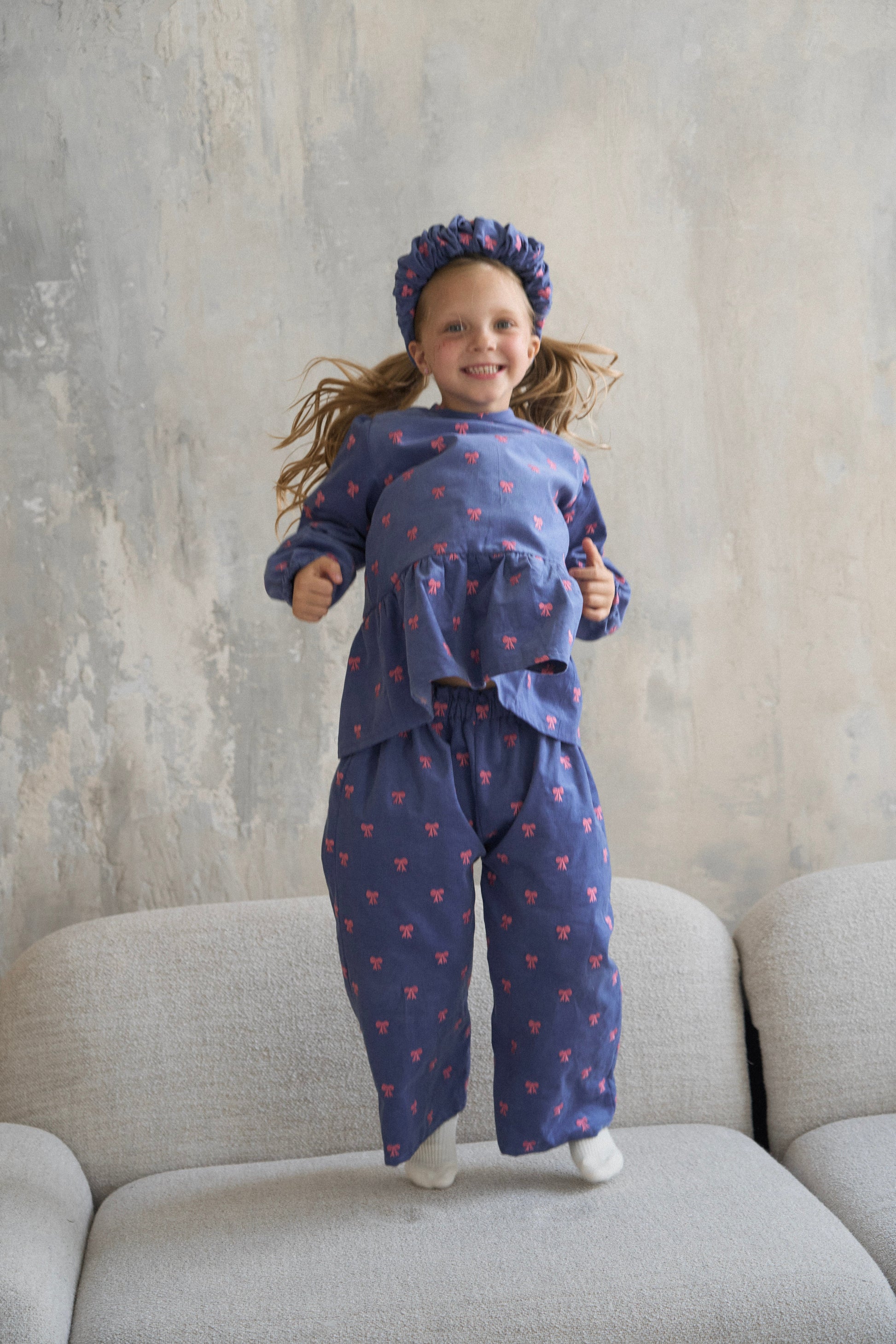 Komplet składa się z bluzki i spodni, osobno można zakupić opaskę i spinki.