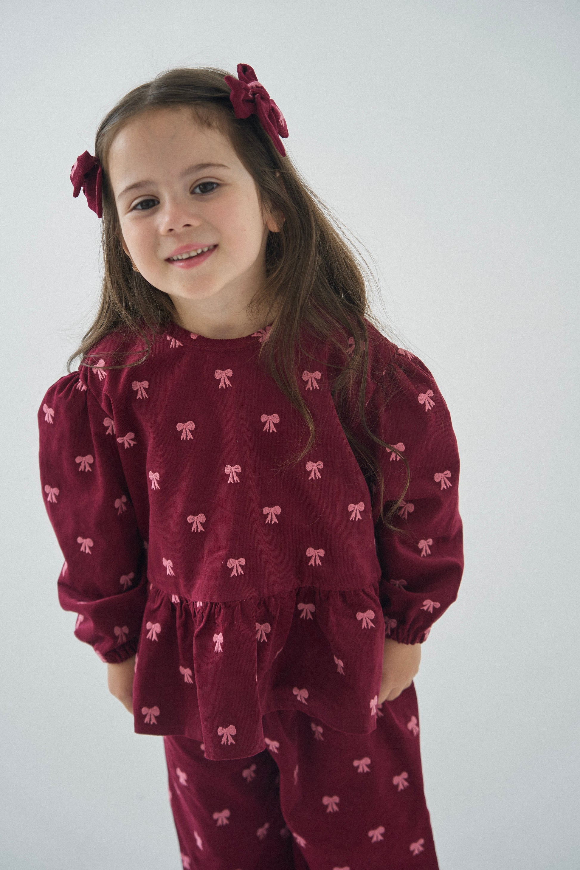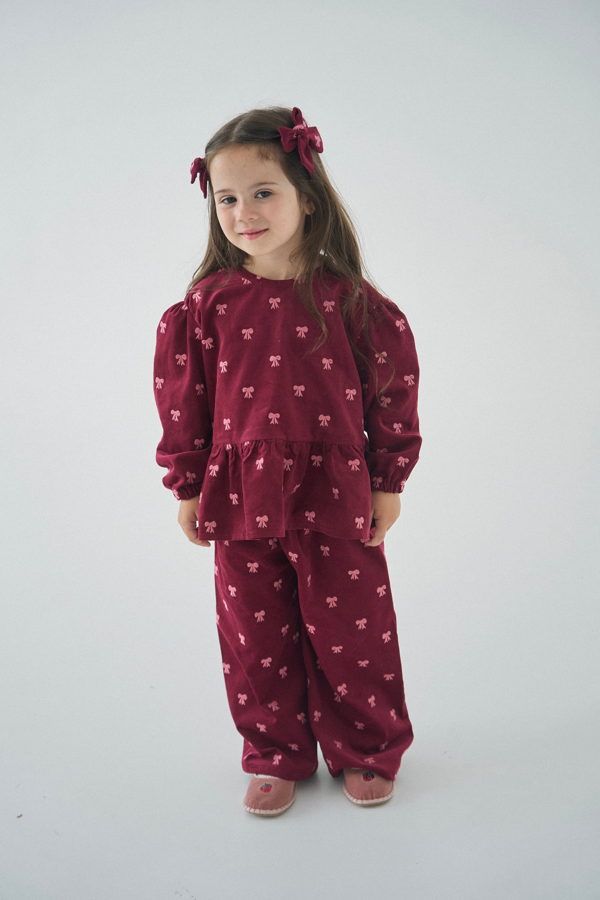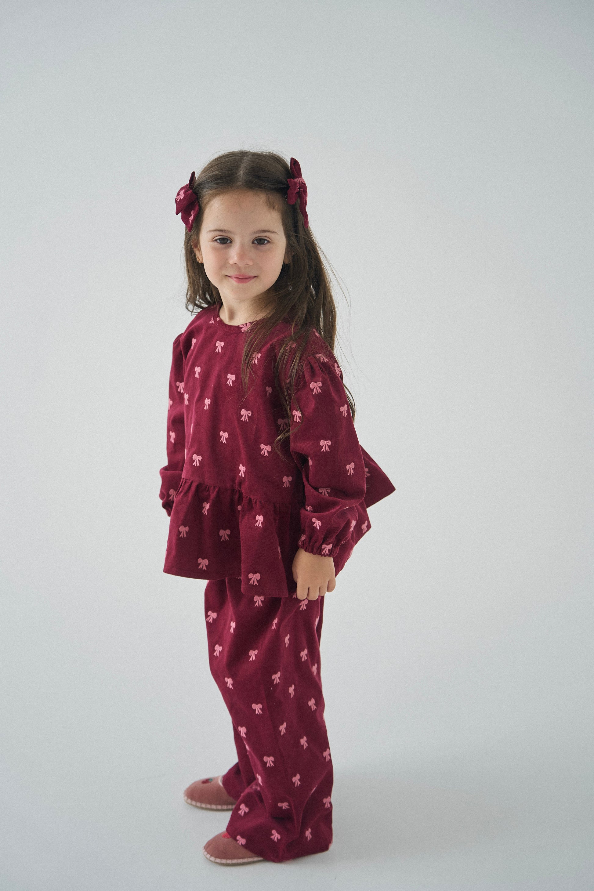 Komplet składa się z bluzki i spodni, osobno można zakupić opaskę i spinki.
