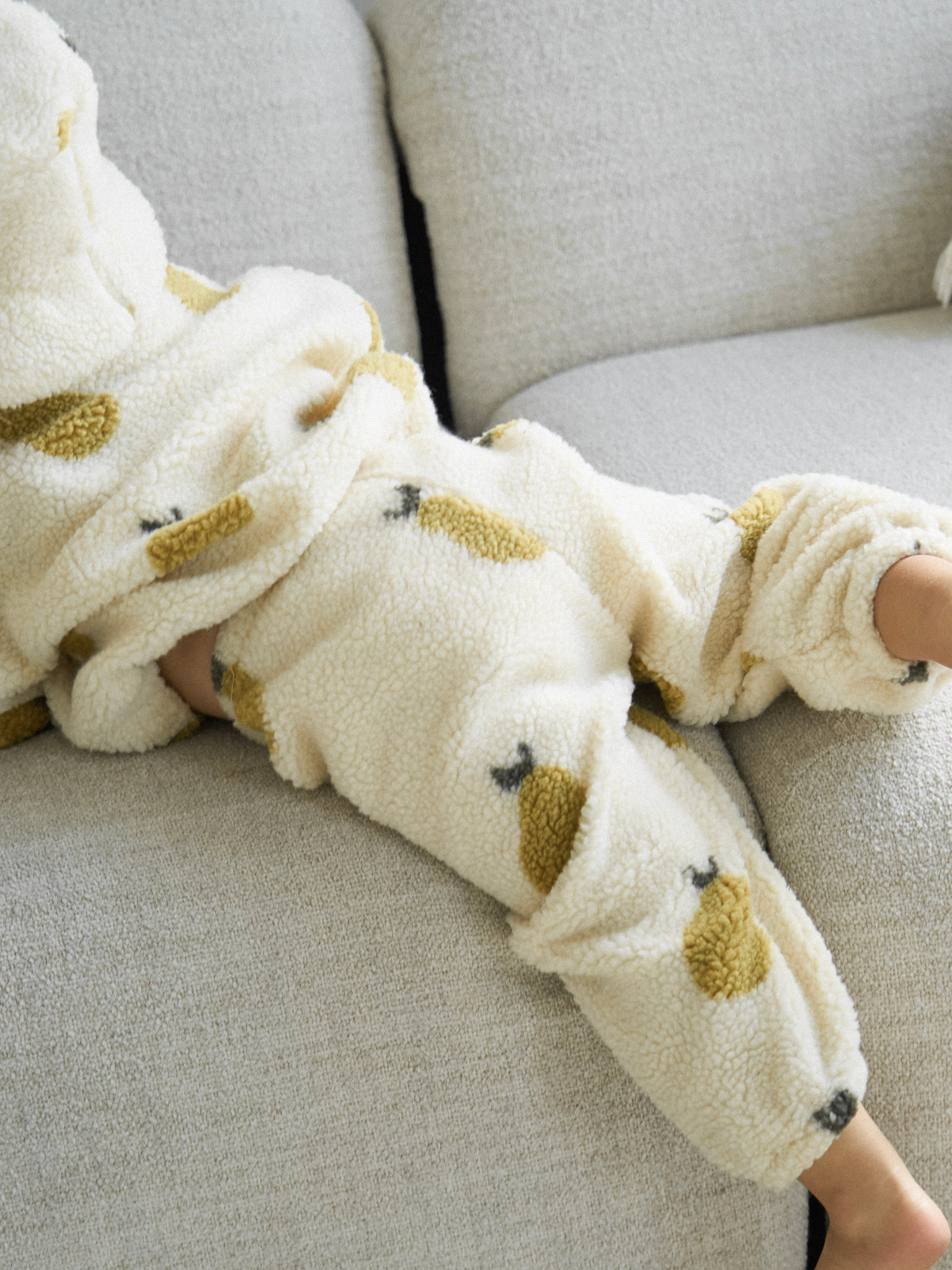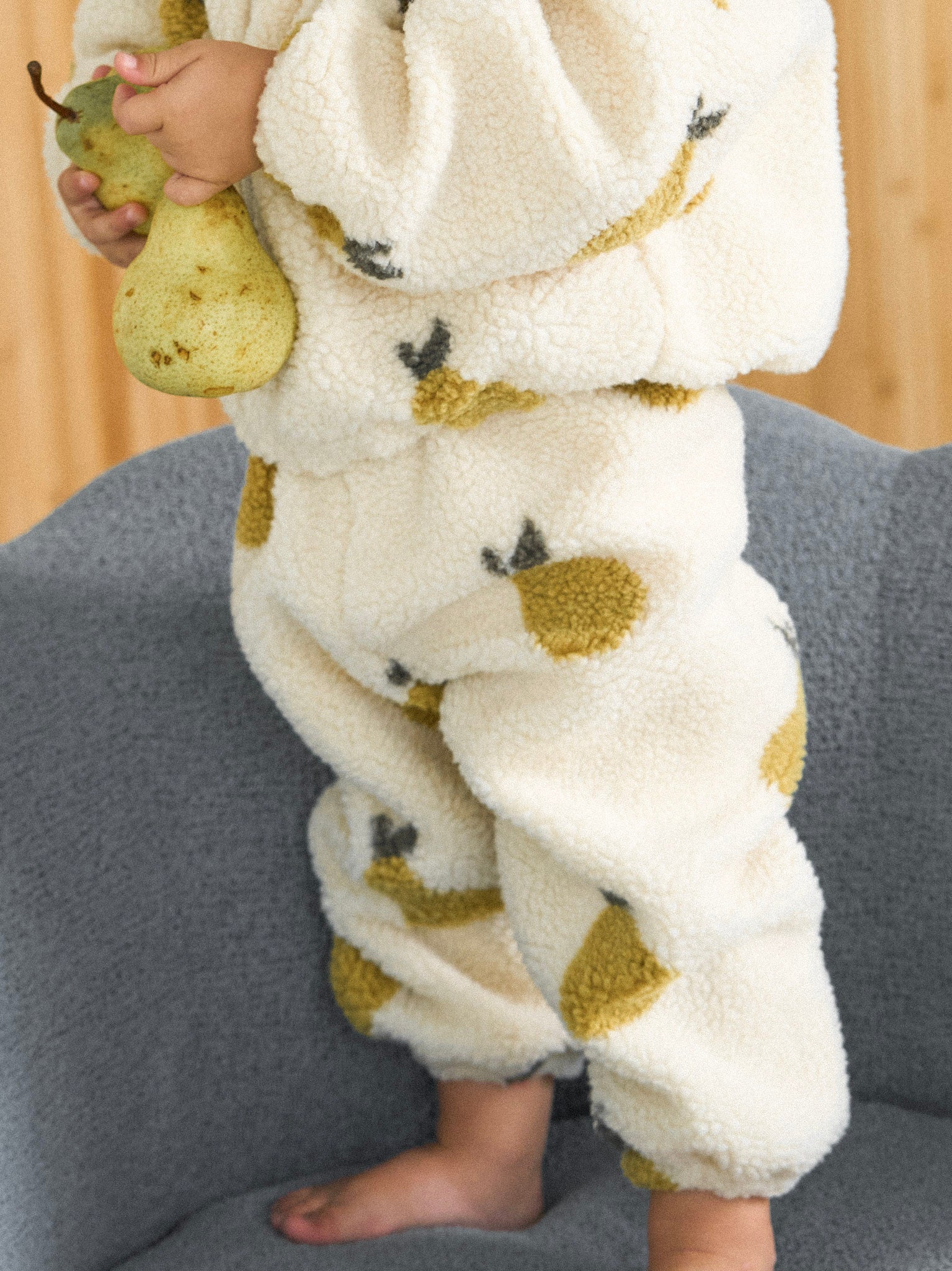 Szerszy, niekrępujący ruchów krój. Gruba dzianina typu baranek, spodnie outdorowe na jesień.