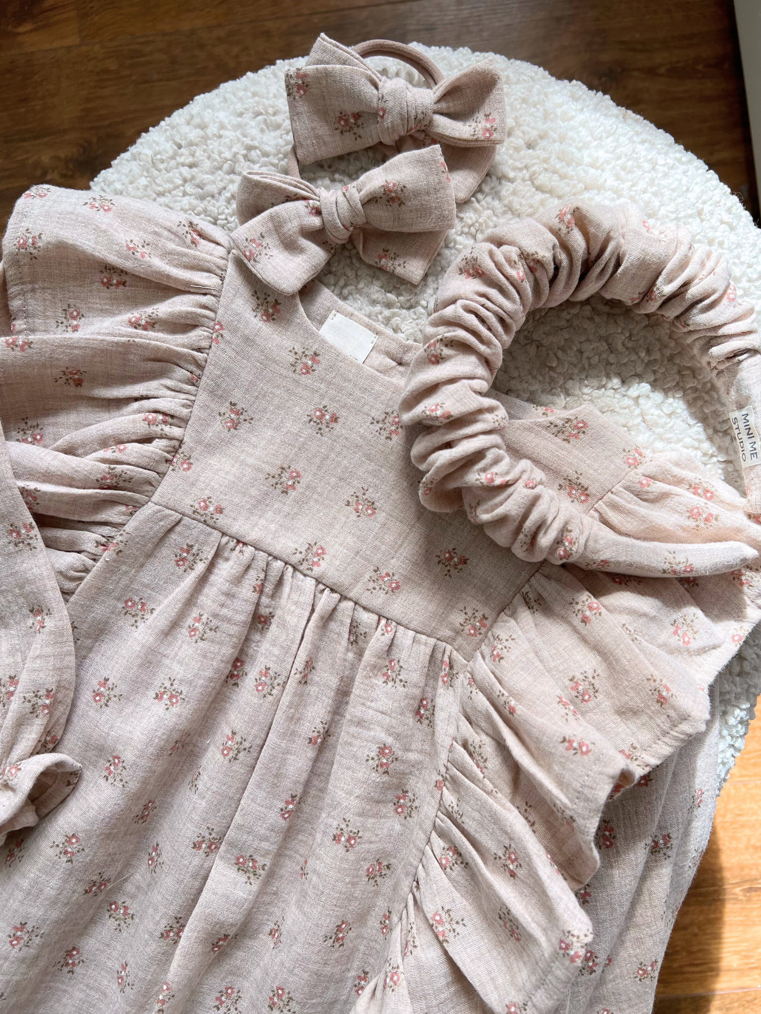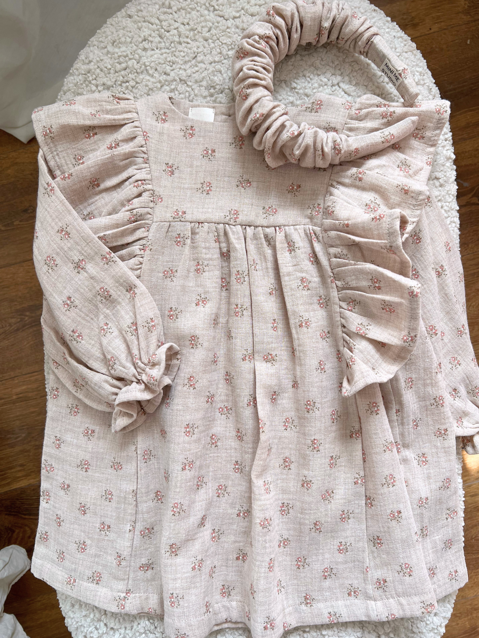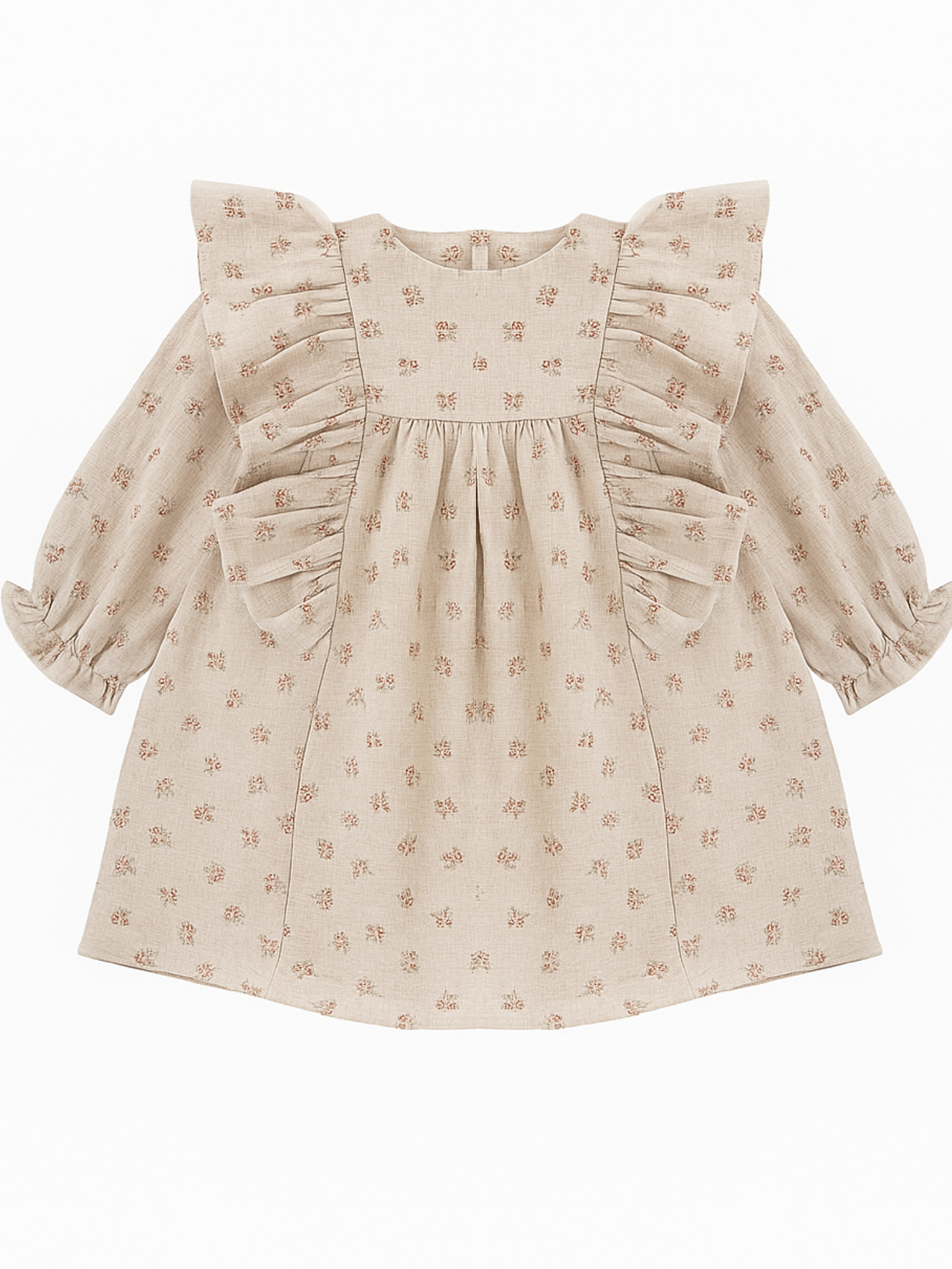 Sukienka z bawełnianej beżowej tkaniny muślinowej, w delikatny kwiatowy wzór. Must- have na jesień!