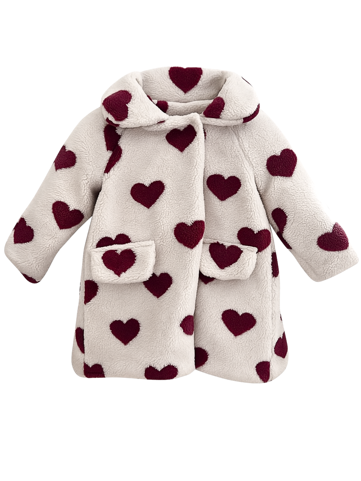 Płaszczyk w bordowe serca z kołnierzykiem, na ocieplanej podszewce - idealny zimę.